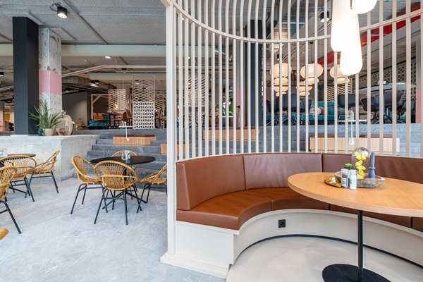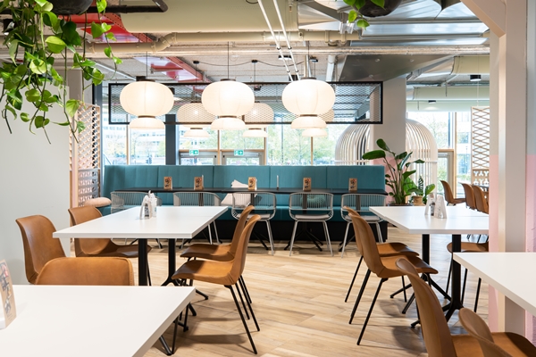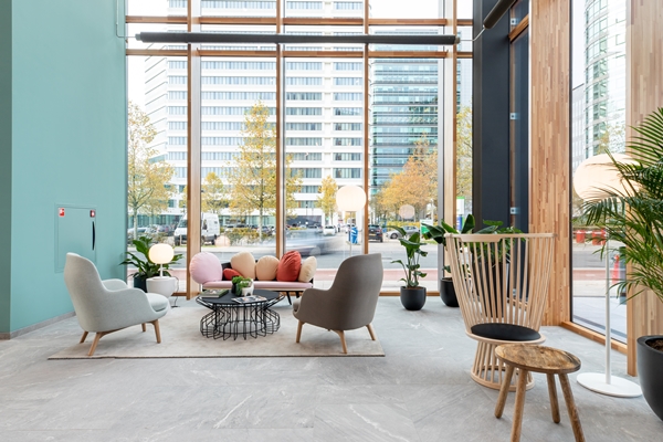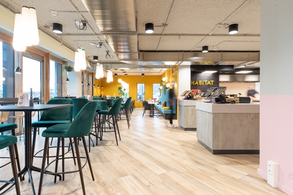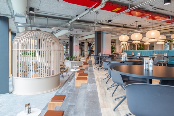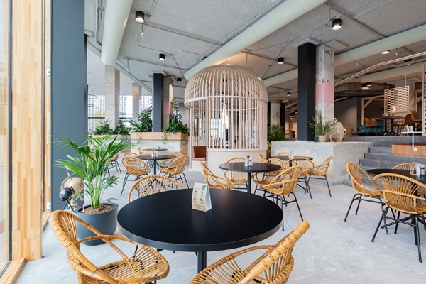 Zo zijn er opvallende ‘kooien’, die plek bieden aan ongeveer acht personen en zijn er diverse eet-, ontmoet- en flexwerkgebieden gerealiseerd. De buitengebieden voor de entree fungeren als (openbaar) terras.