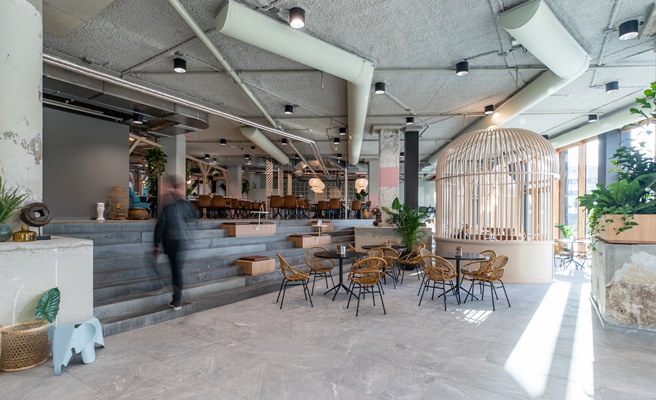 heeft de begane grond omgevormd tot een geheel van verschillende gebieden met diverse functies, waarbij het concept ‘urban jungle’ richtinggevend was.