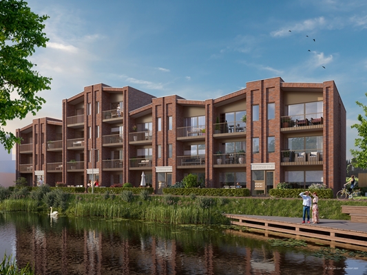 Aan dezelfde route staat het bouwdeel met appartementen. Zowel de voordeur als de buitenruimte van deze woningen is volledig op het water gericht. Qua stijl verwijzen ze naar de pakhuizen die in het verleden te vinden waren aan deze kade, laat het architectenbureau weten.