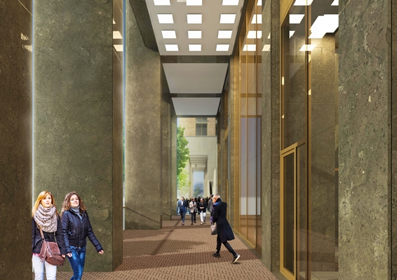 Volgend uit deze geleding opent de arcade zich in het midden wat meer, waardoor er daar een zicht dwars door het gebouw ontstaat. Het open karakter, de natuurstenen trappen en de goudkleurige kozijnen dragen bij aan een chique uitstraling, stelt Klunder Architecten.