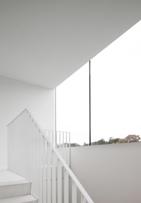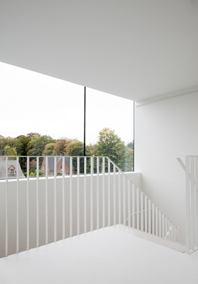Onder het gebouw ligt een verzonken parkeerruimte, die zich aan de achterzijde van het pand naar de tuin opent. De parkeerplekken baden daardoor in daglicht en de relatie met de landschapstuin is voelbaar. Ook de witte foyer wordt in de open parkeerruimte voor de bezoekers al duidelijk aangekondigd.