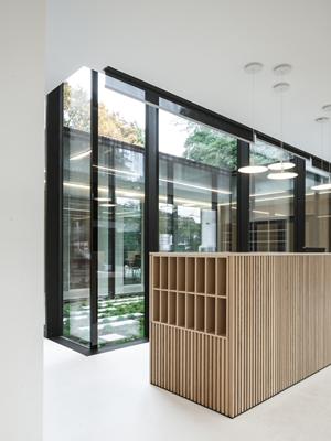 De opdrachtgever wilde twee wachtzones bij de aktezalen. Om privacy te creƫren zonder de transparantie van de open plattegrond teniet te doen, heeft Abscis Architecten de centrale patio als structurerend middel ingezet.