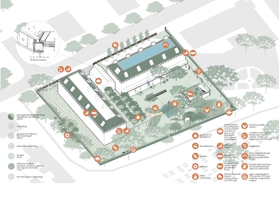 ““Het bouwplan voegt zich op goede wijze in het beeld van de andere gebouwen op het katholieke complex”, stelt de jury over het winnend plan. “Daarbij worden de historische gevels aan de Dobbelmannweg hersteld. Er is gekozen voor een bijzondere eigentijdse vormgeving, waarin wordt verwezen naar de verfijnde architectuur van de andere gebouwen op het complex. Qua natuurinclusief bouwen zijn de gestelde kaders overtroffen. Dit plan doet de biodiversiteit ten goede.”