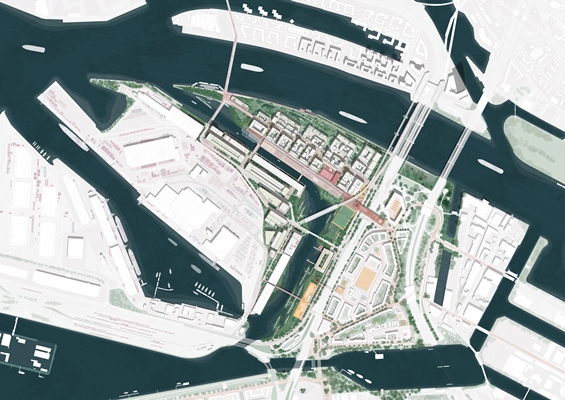 De stad Hamburg wil het voormalige havengebied Grasbrook aan de zuidoever van de Norderelbe transformeren tot een nieuwe stadswijk. In de ontwerpwedstrijd bereikte het plan ‘The Open City’ van