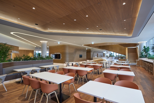 verdieping is een restaurant voor alle medewerkers ontworpen. Met warme houttinten, natuurlijke materialen en veel groen heeft UNStudio hier een ruimte gecreerd waar medewerkers zich weer even kunnen opladen. Het restaurant is in verschillende zones verdeeld en in elke zone worden andere gerechten geserveerd.