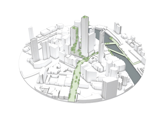 Deze toren maakt deel uit van de ‘Green Spine’, een volume dat is gesplitst in twee torens met ieder een spiraalvormige opbouw. Deze opzet biedt onder meerde mogelijkheid om de torens van uitzicht, daglicht, terrassen en verschillende groene voorzieningen als pocketparkjes te voorzien.