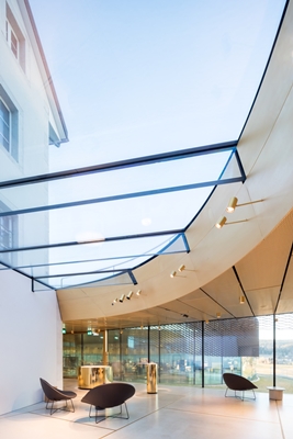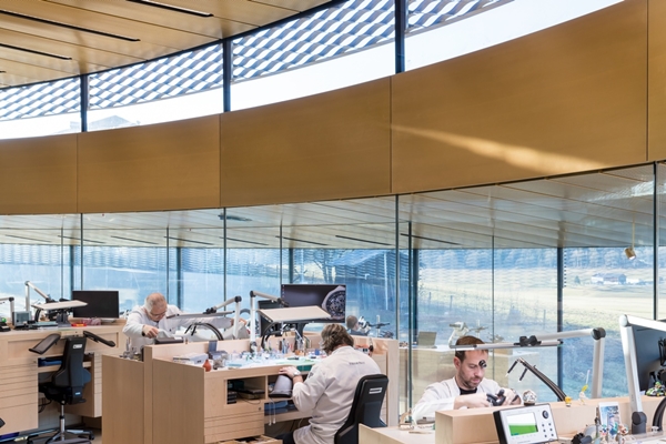 BIG heeft gekozen voor constructief glas om het interieur te voorzien van ruim binnenvallend daglicht. Tegelijk biedt het gebouw op deze manier een prachtig zicht over de Vallée du Joux.
