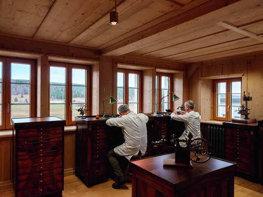 De banken voor de horlogemakers van het restauratieatelier zijn volledig nagemaakt van de oorspronkelijke banken door lokale ambachtslieden die zich inzetten voor het behoud van traditioneel vakmanschap.