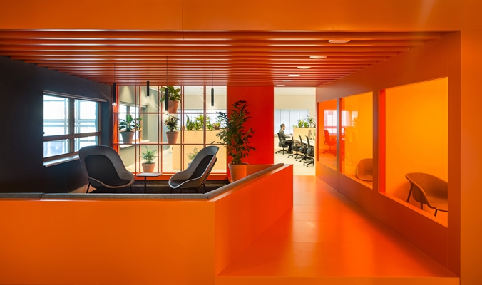 Duidelijke routes en zichtlijnen zorgen in het flexkantoor op de derde verdieping voor een rustige en comfortabele werkomgeving met een verscheidenheid aan plekken. Een āsuperflexzoneā bevat werk- en loungeruimtes en flexibele ruimtes voor projectmatig werken. Opvallend is het oranjerode accent in de ruimte, dat verwijst naar de primer die wordt gebruikt in de bouw en in de scheepsbouw.