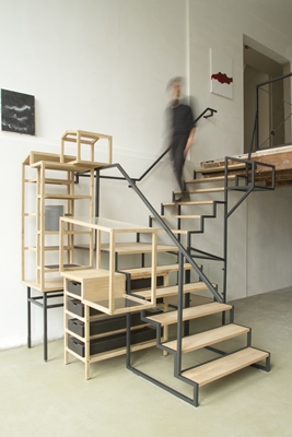 Studio Mieke Meijer heeft de industriële vormentaal gebruikt voor een ‘functionele constructie’, die werk- en bergruimte biedt. De studio ontleent aan de (foto’s van de) fabrieksgebouwen vormen en details, verandert schaal en verhoudingen en voegt de onderdelen samen tot een nieuw object.