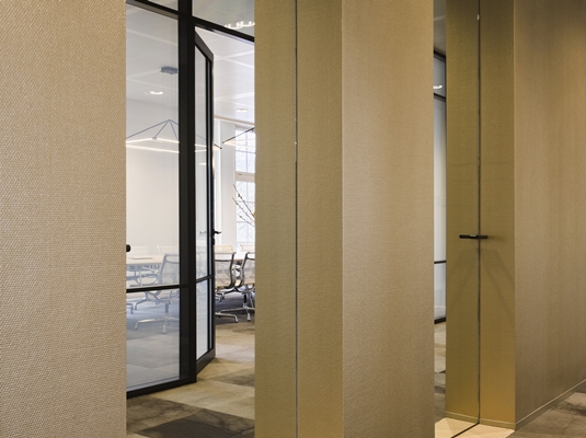 Door middel van ‘vintage’ glaswanden met frames zijn de verschillende functies gescheiden, maar is tegelijkertijd een transparant kantoor met sterke visuele relaties tussen de ruimtes ontstaan. Zwart, grijstinten, messing en eiken bepalen de uitstraling en sfeer van het kantoor, kunstwerken die met het interieur zijn geïntegreerd zorgen voor extra accent.