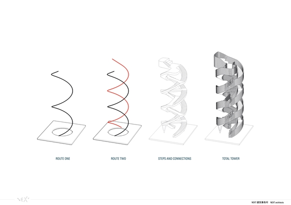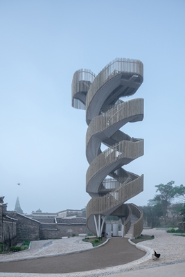 De nieuwe uitkijktoren staat op de plek waar eerder ook een stond, als onderdeel van de historische verdedigingswerken van het dorp. In het nieuwe gebouw zijn twee routes met elkaar verweven. De elkaar omarmende paden doen denken aan een gigantische Chinese drakenkolom.