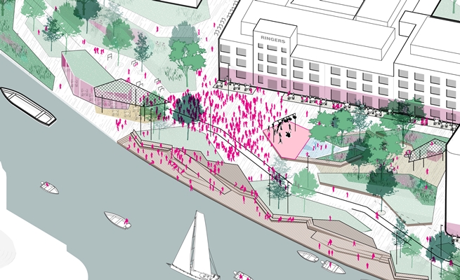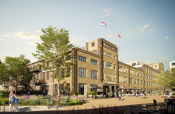 verzorgt het ontwerp voor de transformatie en dat voor vier nieuwe gebouwen die in de directe omgeving gepland staan. “De multifunctionele pleinruimte voor de entree van de Ringersfabriek herstelt de historische verbinding tussen de fabriek en het water en geeft het gebouw opnieuw een adres”, meldt Delva.