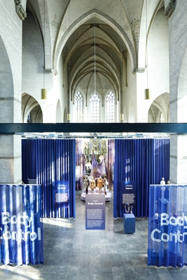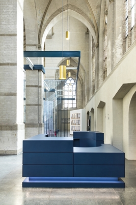 Kraft architecten en Studio met met hebben als identiteitsdrager van Museum Arnhem in het kerkgebouw gekozen voor een diepe kleur blauw. Alle tijdelijke elementen zijn hierin uitgevoerd. De kleur past goed bij de lichtkwaliteit van de kerkzaal, maar bleek ook heel geschikt als neutrale achtergrond voor de geëxposeerde kunst, vertelt Kraft architecten.