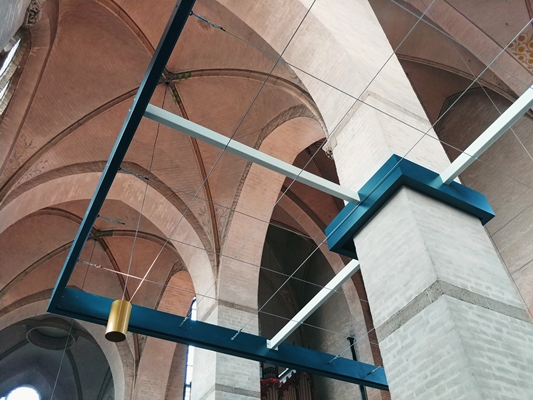 Alle nieuwe elementen kunnen zonder sporen achter te laten weer worden verwijderd. “Dit was vooral een uitdaging bij functionele plafond, dat op zes meter hoogte lijkt te zweven en de tentoonstellingsruimte afbakent”, vertellen de architecten. Het is volledig door middel van een klemconstructie bevestigd aan de bakstenen poeren van de kerk.