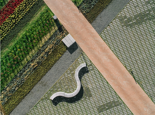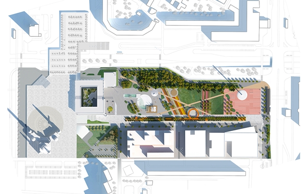 DROM heeft de belangrijke verbindingsas over het plein richting een rand van het gebied verlegd. Daar verbindt de as, omzoomd met dicht opeen geplante bomen, de aangrenzende woonbuurten met een nieuwe promenade en paviljoens. Het plein biedt de bezoekers nu verschillende speeltuinen, een café, een eetstalletje en een uitkijkplatform.