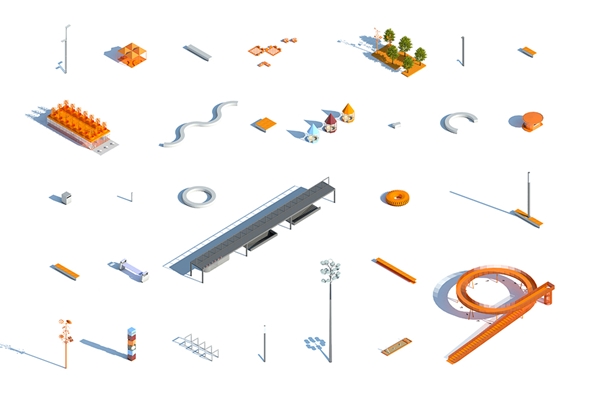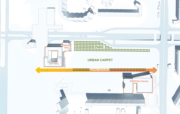 Voor elk plein heeft DROM een eigen bestratingspatroon ontworpen. Voorts hebben de architecten de pleinen voorzien van meubels en verlichting, ontwikkeld en vervaardigd in nauwe samenwerking met lokale producenten. Daarmee heeft DROM hun economisch willen laten meedelen in het project, ook met het oog op toekomstig onderhoud.