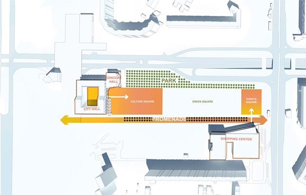 Tot slot is er het ‘Cultuurplein’, voorzien van een fontein en een nieuw, ondiep bad waar kinderen op hete zomerdagen in kunnen spelen. Elk plein heeft zijn eigen ankerprogramma, in samenhang met de promenade. Het amfitheater doet tevens dienst als café en het ronde bad fungeert ’s winters als ijsbaan. Het cirkelende uitkijkplatform, in het kenmerkende Kamaz-oranje geschilderd, voegt een verticaal element toe.