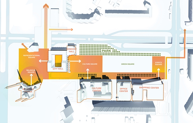 Het centrale Azatlyk-plein was ontworpen rond een centrale as, die het gemeentehuis moest verbinden met het Lenin-museum, dat nooit is gebouwd. Inmiddels had het zijn functie als sociale ontmoetingsplek verloren en was het eentonige plein niets meer dan een relict van de sovjetgeschiedenis.