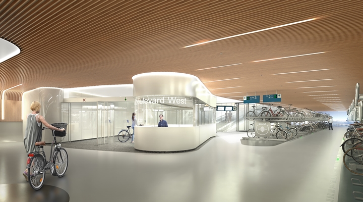 De ondergrondse stalling is tevens ontworpen als verlengstuk van de openbare ruimte. De entrees en trappen worden afgewerkt met dezelfde donkergrijze natuursteen als op de boulevard. Extra ruime trapgaten met grote glasoppervlakten geven vanaf de boulevard al zicht op de stalling, die volgens VenhoevenCS een licht en uitnodigend karakter krijgt.