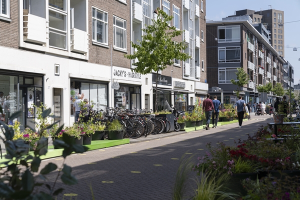 “We hebben samen met gemeente en lokale ondernemers gekeken hoe we de buurt groener konden maken, en tegelijk de terrassen op veilige wijze konden verruimen ter ondersteuning van de lokale economie.” Ook de vraag hoe bewoners meer ruimte kunnen krijgen om deze zomer te genieten van hun straat is in het plan meegenomen.