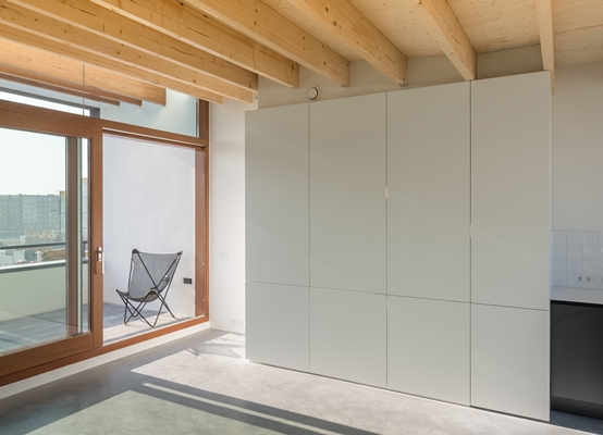 De grote en lichte woonkeuken is voorzien van een houten dak. De aansluitende loggia biedt niet alleen zon en zicht, maar zorgt tevens voor beschutting tegen wind. Het deels open dak laat extra daglicht de loggia en woning binnen en accentueert de grotere verdiepingshoogte.