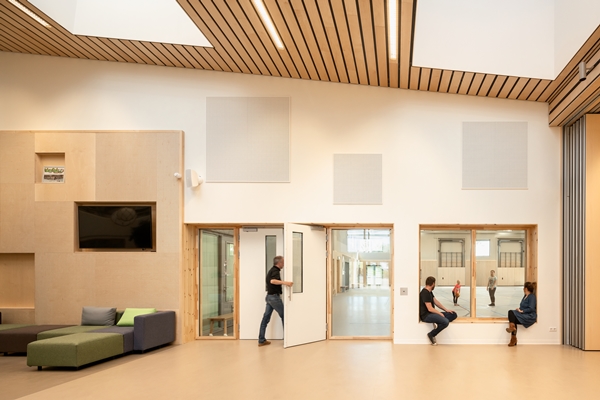 Om de functie van de centrale ruimte als sociale hart van het gebouw te versterken, is deze voorzien van een gecombineerde bar en balie met bijbehorende zit- en loungeplekken. Aan de andere kant is een âkunstmuurâ gerealiseerd waarin werken en (sport)prijzen kunnen worden gepresenteerd.