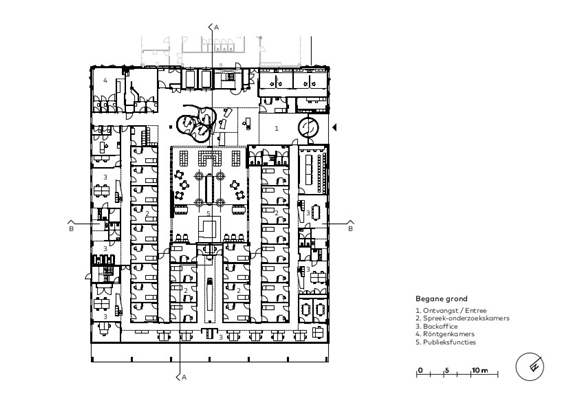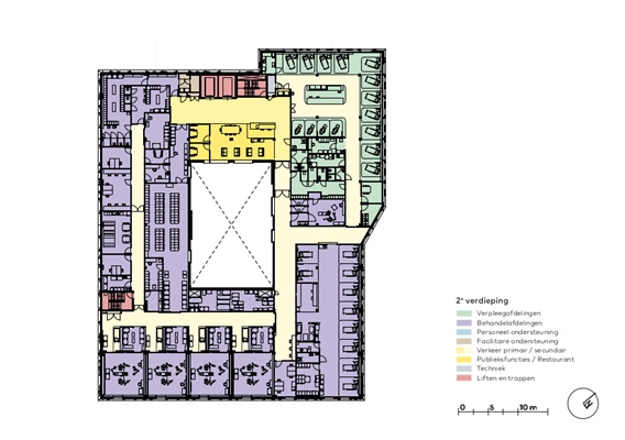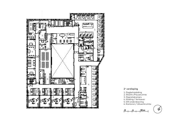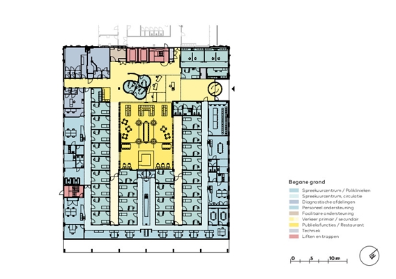 Rond deze centrale ruimte zijn op de begane grond de publieksgerichte functies zoals het spreek- en onderzoekscentrum en poliklinieken. Op de eerste verdieping is de verpleegafdeling gesitueerd, aan de centrale verkeersruimte rondom het atrium.