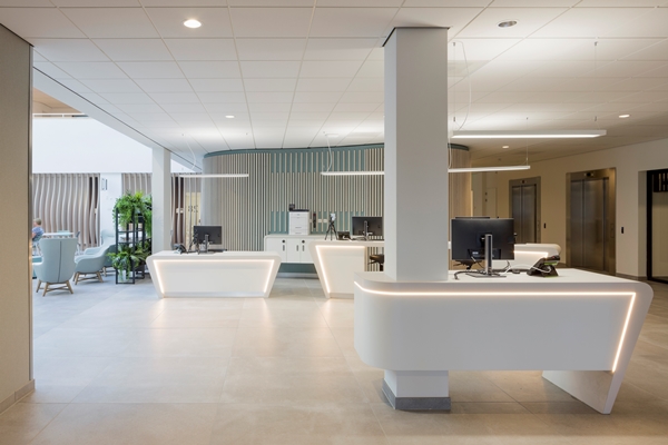 De nieuwe kliniek stelt de mensgerichte benadering centraal. Bij binnenkomst op de begane grond treft de bezoeker geen traditionele centrale balie, maar vier moderne en compacte ‘desks’ waar medewerkers de patiënten op persoonlijke wijze ontvangen en de weg wijzen.