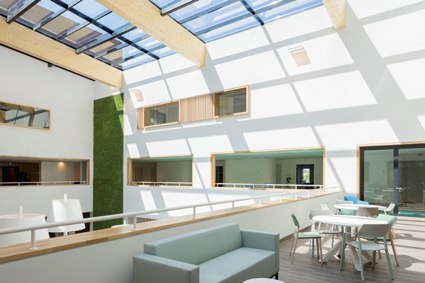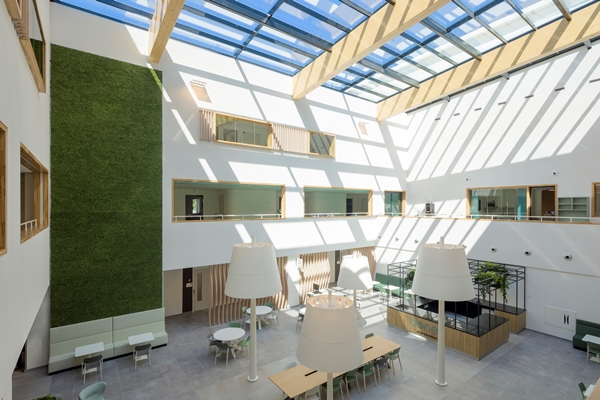 Vanaf deze toegankelijke balies worden bezoekers en patiënten als vanzelf naar het met veel daglicht verrijkte ruime atrium getrokken. Dit hart van het gebouw ontvangt volop daglicht door het glazen dak en met activerende frisse kleuren, houten privacy-schermen, levend groen op de wanden, vier grote ‘schemerlampen’, en uitnodigende zitjes biedt het een rustig en aantrekkelijk wachtgebied.