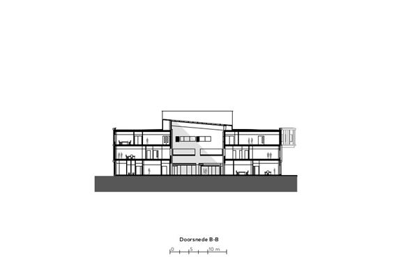 Een luxe stadsvilla, zo omschrijft EGM architecten zijn ontwerp voor het nieuwe centrum. Het bureau ontwierp een compact en stedelijk volume met een duidelijk herkenbare hoofdentree. De gevel is voorzien van ritmisch vormgegeven raampartijen en witte, golvende gevelpanelen zijn als een vitrage om het gebouw gedrapeerd