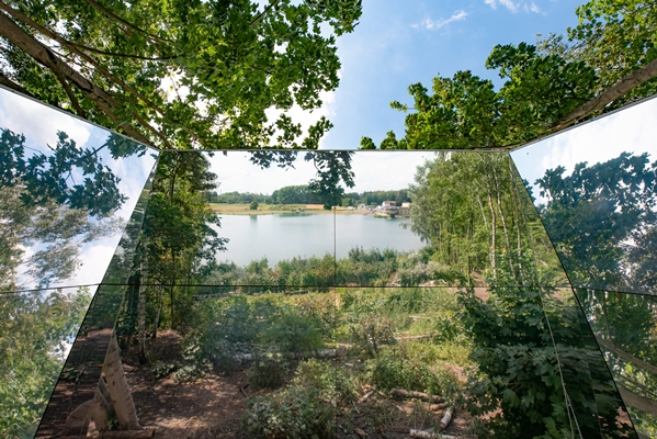 Spiegelend paviljoen biedt verrassend perspectief op landschap