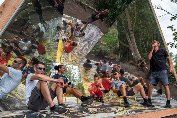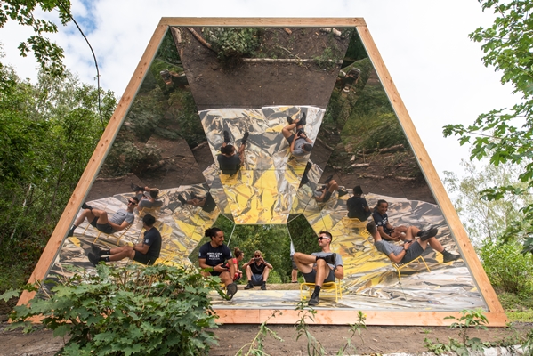 geplaatst. Bezoekers die in paviljoen Reflektor gaan zitten of liggen, krijgen via de spiegels een bijzonder perspectief op het landschap. Andersom oogt het interieur vanaf het naastgelegen meer als een explosie van kleur.