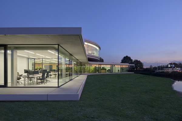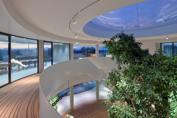 Twee sculpturale halfronde trappartijen in het atrium verbinden de begane grond met de verdieping. Boven de dakvloer van de begane grond zweeft de ringvormige verdieping met vergaderruimten. Deze verdieping heeft gebogen glaspanelen, wat zorgt voor een weids uitzicht over het tuinlandschap.