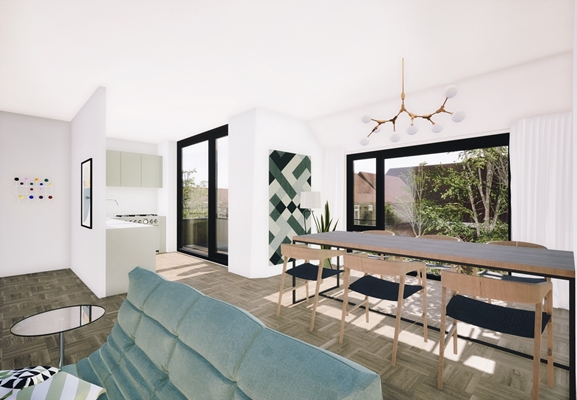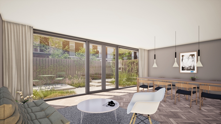 De woningen kenmerken zich door een brede en ruime begane grond met grote glazen gevels, leggen de architecten uit. De begane grond kan worden gebruikt als royale open woonruimte en biedt tevens de mogelijkheid om een extra slaapkamer met badkamer en-suite of een kantoorruimte met afzonderlijke ingang te creëren.