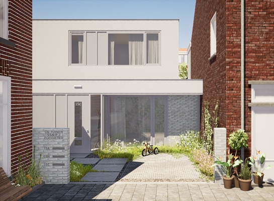 Deelproject ‘De tuinen van Potgieter’ bestaat uit drie woningen, die samen met hun buitenruimten – privétuinen aan de achterzijde en een gemeenschappelijk ‘entreetuin’ aan de voorzijde – aansluiten op de omgeving; qua volume zit het project tussen het straatbeeld en het tuinlandschap in, legt Studio Larkemika uit.