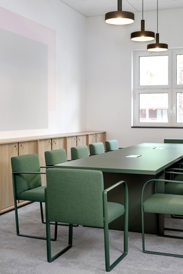 De twee kamers zijn elk voorzien van een groot en opvallend raam, vertelt Hollandse Nieuwe. De muren zijn hier geschilderd in kleuren uit dezelfde reeks als in de open kantoorruimte, zodat vanuit de werkruimte gezien de twee ramen meedoen in het spel van kleur en schaal.