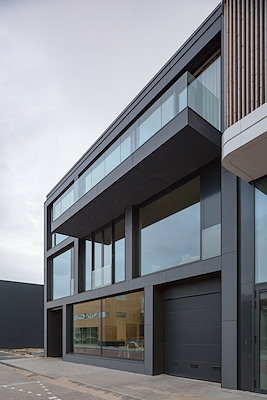 Het bedrijfsgebouw is gerealiseerd met een standaard hallenbouwsysteem, bestaande uit stalen constructieonderdelen, kanaalplaatvloeren en sandwichpanelen. “Grijze vezelcementplaten, stalen constructieve elementen, geslepen betonnen vloeren en veel glas geven het gebouw een robuust karakter dat past bij de identiteit van de gebruikers”, stelt MeesVisser. Zo is een stoer gebouw gemaakt dat zich niet als een standaard bedrijfsgebouw laat kennen.