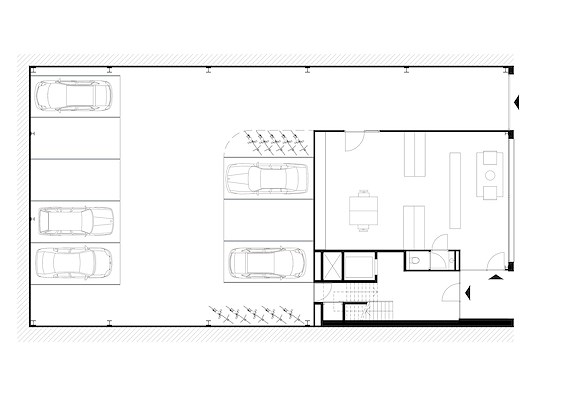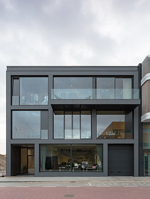 Daarbij heeft het architectenbureau de patio voorzien van een breed terras bovenop de parkeergarage. Verder zijn veel geveldelen te openen en is aan de voorzijde ook nog een balkon toegevoegd. Het grid van de gevel volgt de ritmiek van de achterliggende ruimtes.