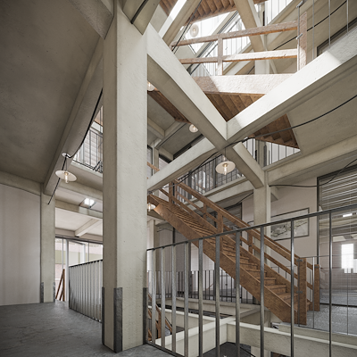 De woningen zijn gerealiseerd rond een centraal gelegen atrium. Door historische structuren en elementen als de betonnen kolommen te behouden, ademt deze ruimte de authentieke, rauwe sfeer van het pakhuis. Ook maakte de keuze voor een atrium het mogelijk om het aanwezige souterrain beter te benutten, meldt KRAGT.