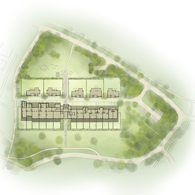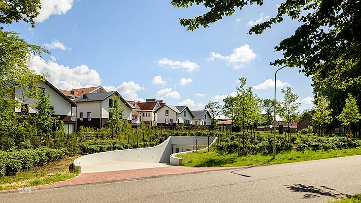 De parkeergelegenheid bevindt zich eveneens onder de grond om de groene omgeving te bewaren. De ruimte tussen het paviljoen en de nieuwe villa’s is ingericht als intieme groene straat. Achter de villa’s bevindt zich de gemeenschappelijke ruimte voor de bewoners, omsloten door grote groene bomen, legt Braaksma & Roos Architectenbureau.