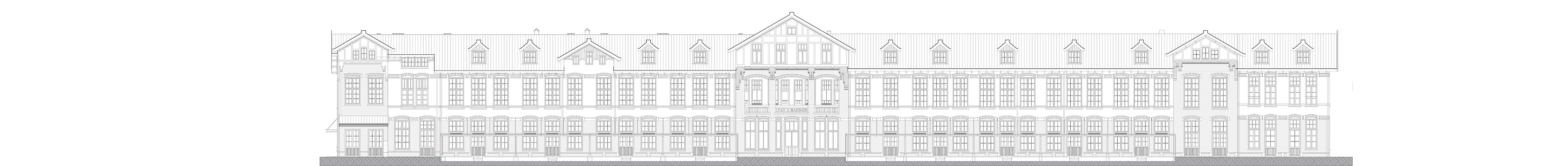 De centraal gelegen ingang en het trappenhuis hebben hun functie behouden en leiden naar de nieuwe appartementen. Bij de rechtervleugel hebben de architecten het gelaagde aanzicht, dat de verloren dienstvertrekken aan het paviljoen gaven, hersteld.