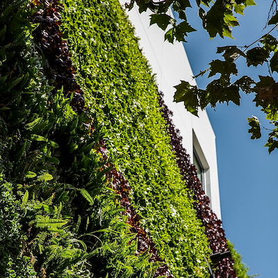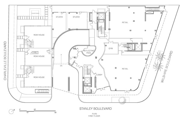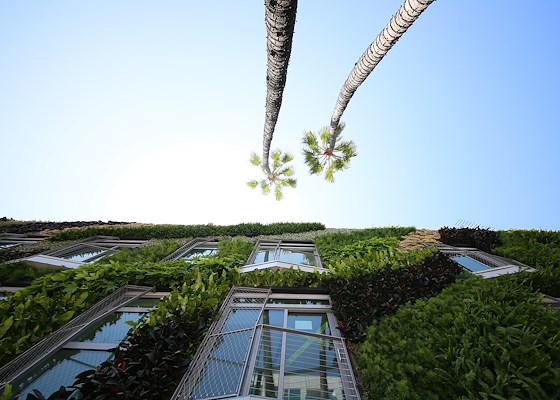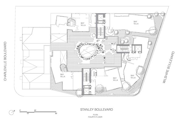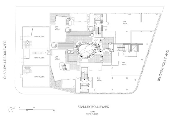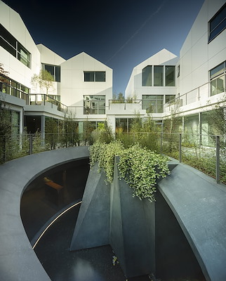 De hoofdentree voor bewoners op de begane grond biedt toegang tot een grote patio, die dankzij de donkere natuursteen en de rotsachtige sculptuur in de dakopening de sfeer van een grot ademt. Aan de buitenkant is het complex voorzien van een van de grootste groengevels van de VS, volgens MAD. Deze is voorzien van beplanting die zelfstandig kan overleven in het lokale klimaat.