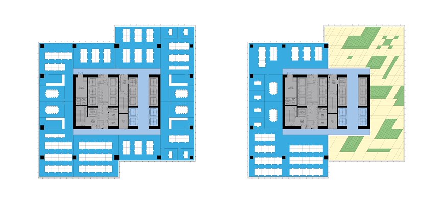 Bevat de toren 60.000 vierkante meter kantoorruimte, in de naastgelegen mall is voor 40.000 m² aan winkelruimte opgenomen. Om zoveel mogelijk etalageruimte op straatniveau te kunnen benutten, beslaat het volume de gehele lengte van de kavel. De hoofdentree wordt gemarkeerd door dezelfde gevelbekleding in honingraatmotief als de uitkijkplatforms van de toren.