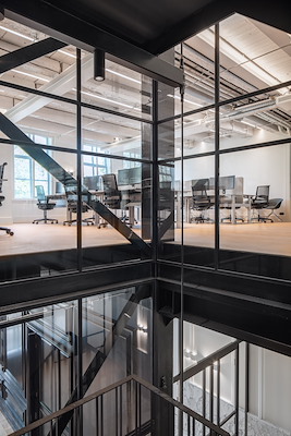 Het voorheen afgesloten en dichte trappenhuis is opengebroken en samen met de nieuwe liftschacht voorzien van glazen puien. De nieuwe trap is uitgevoerd is gevouwen staalplaat, zodat hij veel slanker en transparanter kon worden gemaakt in vergelijking met de oude gemetselde trap.