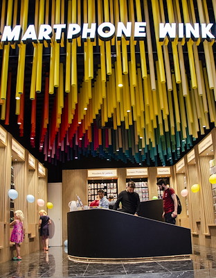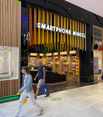 De eerste twee meter van het winkelinterieur is geheel zwart uitgevoerd. Hiermee hebben de architecten een ‘transitiezone’gecreëerd, waar publiek een moment uit de drukte kunnen stappen. Vervolgens kunnen ze verder winkelen, of de smartphone-winkel binnengaan.