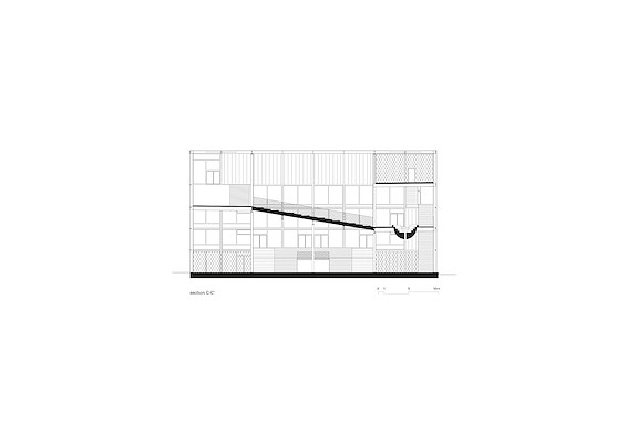 De interieurfuncties zijn opgenomen in een compact volume, dat ongeveer de helft van de kavel in beslag neemt. Omdat er werd gevraagd om meerdere specifieke buitenruimtes, die bovendien op een relatief krap plot gerealiseerd dienden te worden, is ervoor gekozen om deze te stapelen. Door de buitenruimtes en het interieur loopt een doorgaande route, bestaande uit onder meer trappen en hellingen, die de gebruikers op een natuurlijke wijze door het gebouw leidt.