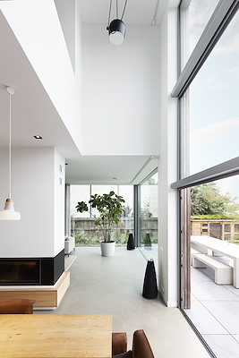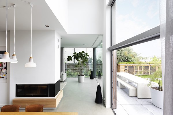 Het onderste deel van de hoge glazen gevel kan geheel worden geopend door de harmonicapui. Tussen de woonkamer en de eetkamer is een speciaal ontworpen ruimtescheidend meubel geplaatst. Hierin hebben onder andere de haard en de televisie een plek gekregen.