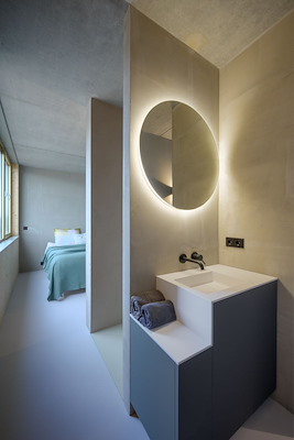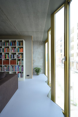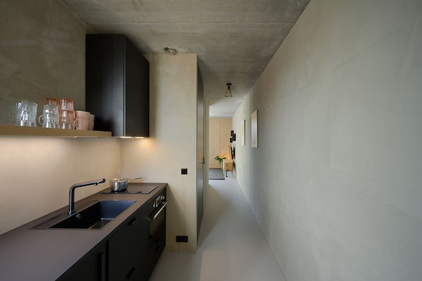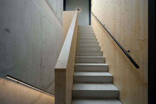 In het interieur is het casco ruw gelaten. De kalkzandsteen is met cement afgesmeerd, de blokken schemeren daar nog doorheen. De breedplaatvloeren zijn onafgewerkt en de houten binnenspouwbladen zijn betimmerd met vurenhouten latten. In het trappenhuis schijnt de zon door het daklicht op de grindnesten in de in het werk gestorte betonwand.
