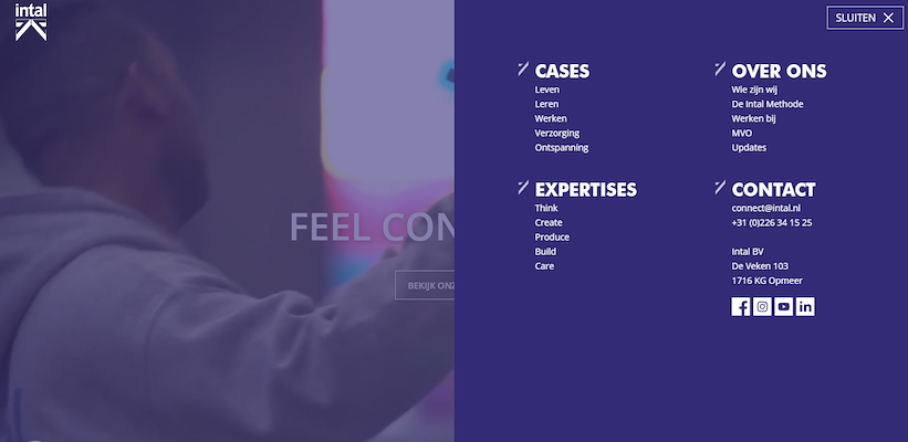 De website benadruk daarbij de vijf expertises die staan voor de Intal-manier van werken, aldus de onderneming: Think, Create, Produce, Build en Care Door deze vijf sterke punten telkens te koppelen aan de projecten die Intal op haar site presenteert, kan de onderneming duidelijk maken waar het merk voor staat.